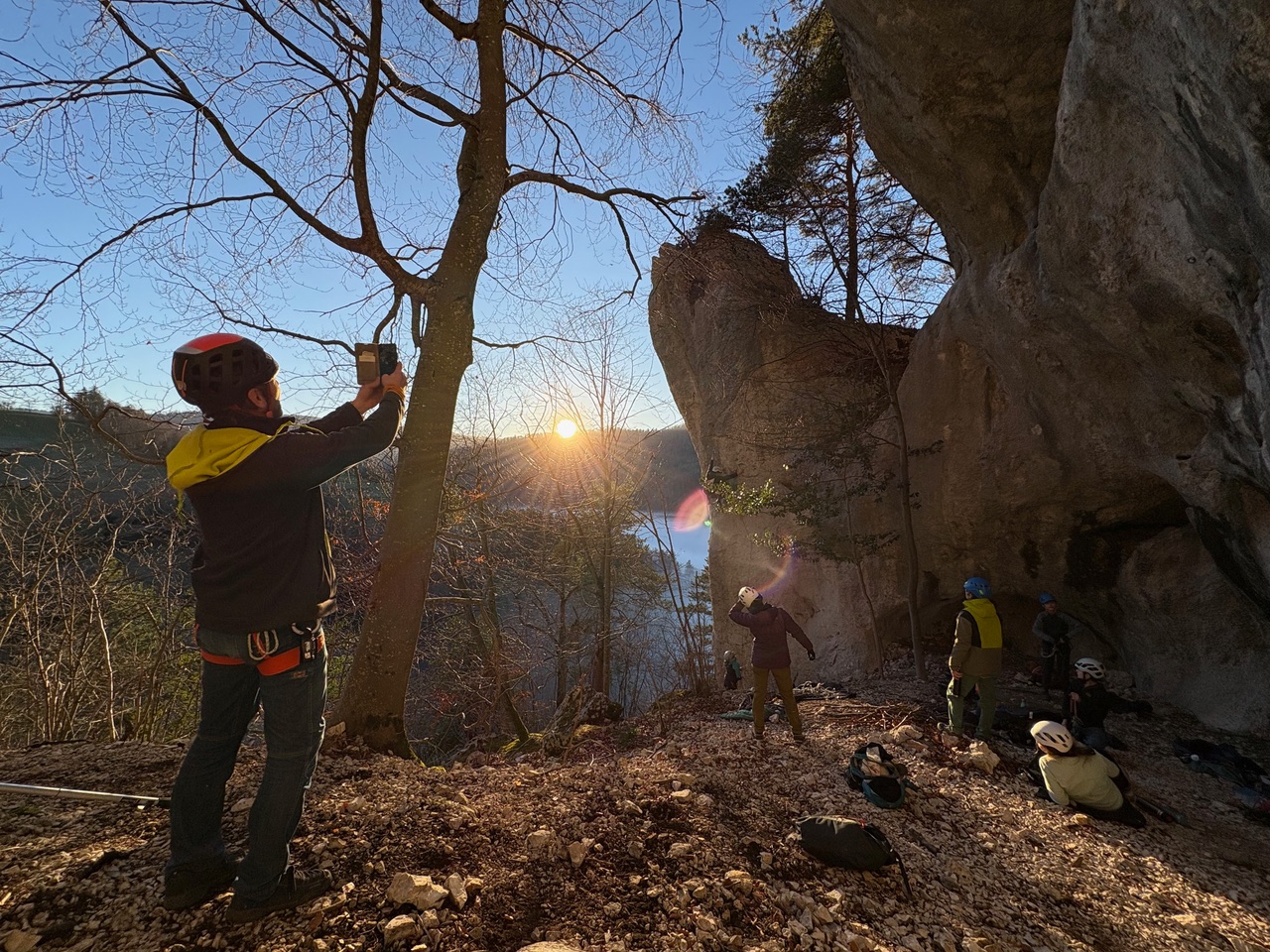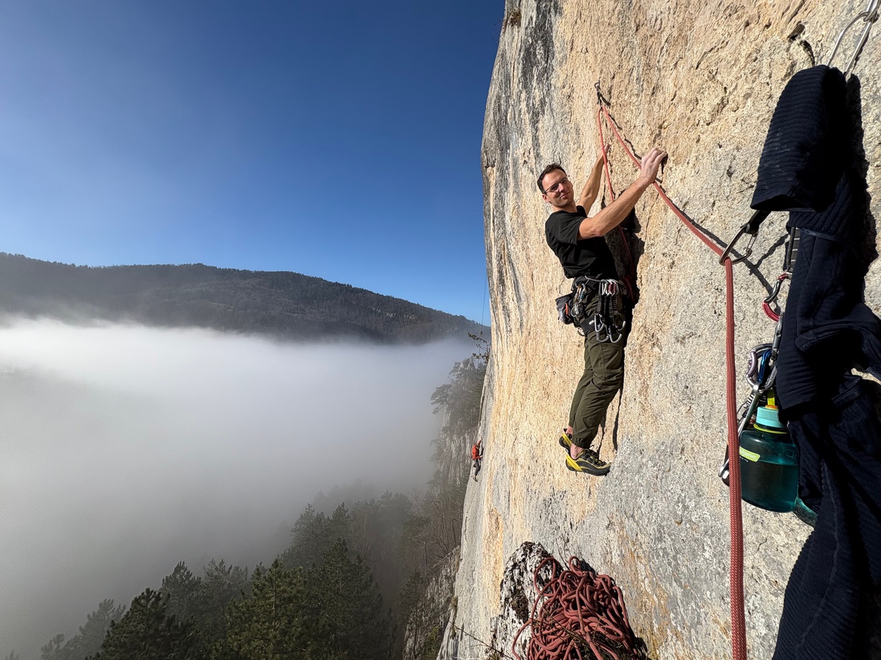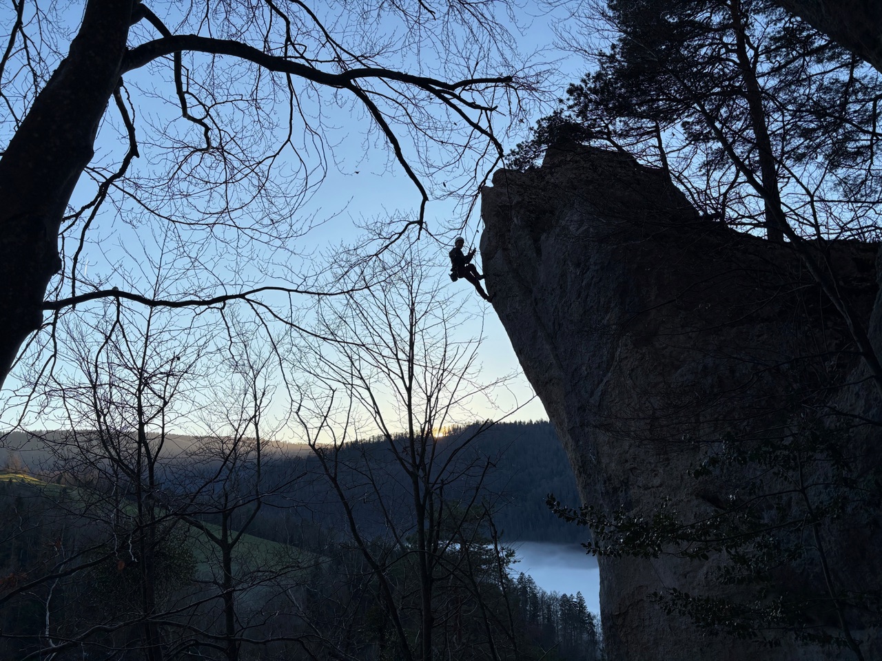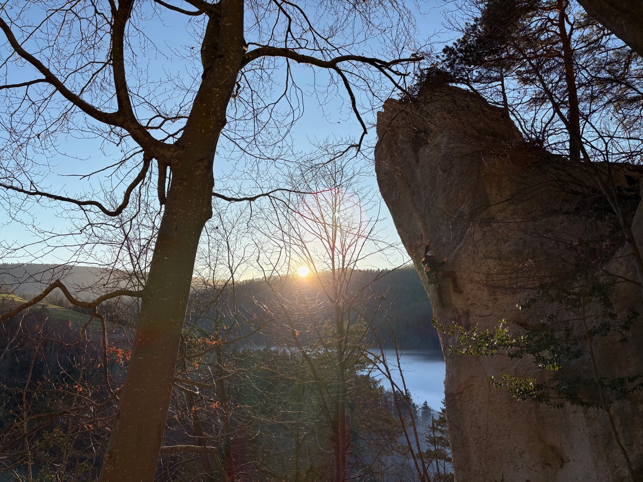 La Jacoterie 2025Passablement d’activité dans ce superbe site au somptueux rocher acéré. De plus, l’endroit est parfait pour l’hiver quand le brouillard ne déborde pas de la vallée de Delémont. Les ouvreurs principaux sont François et feu Philippe Steulet, sans oublier Fred Lapaire et Michel Bréchet. Yann Blanchard a passablement oeuvré dans le secteur, suivi de ses cousins: N+J Zambetti. Il y en a encore d'autres, pardon si je les oublie, et comme il y a beaucoup de secteurs, un bon topo ne serait pas de trop. Parfois j’entends des remarques qui me laissent songeur et qui reflète bien le monde aseptisé dans lequel on vit, surprotégé, sur-assuré, surfait. Je me permets ici d’y répondre. Chacun a le droit de faire comme il l’entend bien sûr, il n’y a pas (encore) de normes DIN ou VSM pour déterminer la distance « réglementaires » entre les points. Pourtant, moi je prétends que pour pouvoir revendiquer un niveau, il faut monter au-dessus du point, là où l’on est obligé de garder son sang-froid pour faire le pas suivant, sous peine de voltiger ; de l’escalade « libre », comme on dit. Mousquetonner un point tous les mètres équivaut, à mon sens, à grimper en second ou faire du True Blue ou encore de la via feratta. A chacun de choisir ce qu’il lui plaît ou pas, ce n'estvpas le choix qui manque. Pour ma part, quand j’ai appris à grimper, il n’y avait pas encore toutes ces moulinettes, et les voies étaient souvent dotées de zones où il ne fallait pas tomber. Parfois nous étions forcés de laisser un mousqueton de but et renoncer; puis s'entraîner afin de revenir plus fort pour réaliser le projet. J’ai développé une bonne notion de ce qu’est l’engagement, une bonne confiance en moi et des réflexes qui m’ont rendu beaucoup de services au cours de ma carrière. Je ne vais surtout pas dire que "c'était mieux avant", loin de là, mais un peu plus de réflexion et d'ouverture d'esprit ne ferait pas de mal, parfois. Non, l’escalade n’est pas un vulgaire sport normalisé ou seule la performance compte, c’est une activité libre et parfois aventureuse. Ne mélangeons pas tout et laissons les murs d’escalade, et surtout le monde qui va avec, aux villes. Qu’importe, qu’on mette beaucoup de spits ou peu, le travail et l’abnégation que demande l’ouverture de voies, et leur nettoyage, est souvent sous-estimé de certains répétiteurs qui se contentent juste de râler et de mettre des étoiles comme au Gault et Millau. Comme dans toute œuvre que l’on créé avec amour, on y met de sa personnalité. Merci à tous ceux qui, sans exceptions, nous permettent de nous éclater dans notre bô Jura, et qui partagent leurs créations. Pour en revenir aux nouveautés 2023 - 25, il faut monter à la 7e épingle à cheveu de la route qui mène à la ferme de la Jacoterie ; pour situer, la voie nommée « Bestialidé » se trouve à la 3e épingle. De la 7e, une minute de marche dans la forêt mène au départ des nouvelles créations (voir image n°1), avec tout à gauche, le départ du "Plaisir 1983"qui mène aux voies 1 à 6 de mon topo. Ensuite, au milieu, on trouve la voie 7 "Lunettes noires". Un peu plus loin la voie 9 "La petite piquette" et enfin les chaînes qui permettent de monter au secteur "Friends" Sauf erreur, toutes les voies ont été enchaînées, elles sont toutes superbes. Le n° 5 "La 3e guerre" 7c est en passe de devenir classique, elle s'est même gravie à vue en février 2025. "Hyperjacotte" est une voie très "montagne", de deux longueurs, avec un pas obligatoire dans la première, qui comme son nom l'indique, donne l'impression de grimper sur une râpe à fromage. Lunettes noires, celles que j'ai envie de porter quand je regarde le monde, pourrait devenir une classique pas trop dure, à l'image de "Plaisir 1983". A son premier relais, on peut tenter la "Tempête sous crâne", une magnifique longueurs aux limites de l'adhérence.