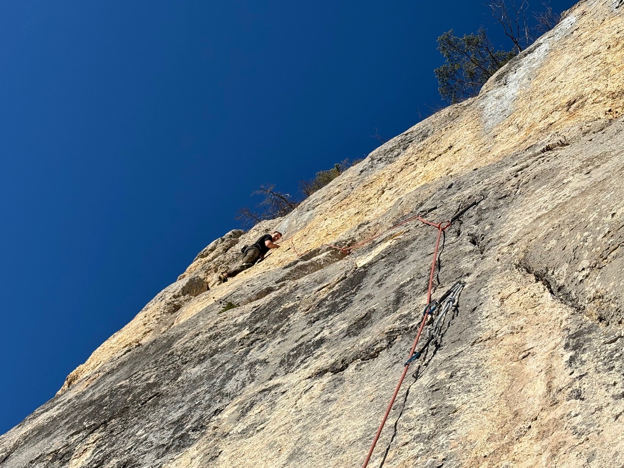 Enfin à droite, on a : Le gros rouge qui tache 7c Du premier relais de la « Petite piquette », la voie file sur la gauche dans un gros mur, moulinette à 35m. Soutenue, dans un rocher agressif, avec un repos au milieu. Ouverte du haut par Matt Mauvais, hiver 23/24, enchaînée par ce dernier le 8.02.2025