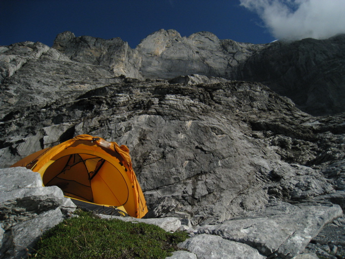 La voie est possible à la journée depuis l'hôtel, mais il ne faut pas traîner! Et attention aux orages! Par contre, l'emplacement de bivouac est confortable et il y a peut-être de l'eau (de pluie) à 50m à l'ouest
