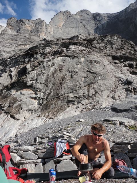 Notre team était composé de 4 personnes efficaces avec des rôles bien définis. Denis Burdet et moi-même pour l'ouverture de la voie, Gaston (Raphaël Gassmann) pour l'intendance (portages, chargement des accus et cuisine) et Loïc Béguelin qui nous a fait 2 gros portages jusqu'au pied de la voie avant de devoir rentrer.