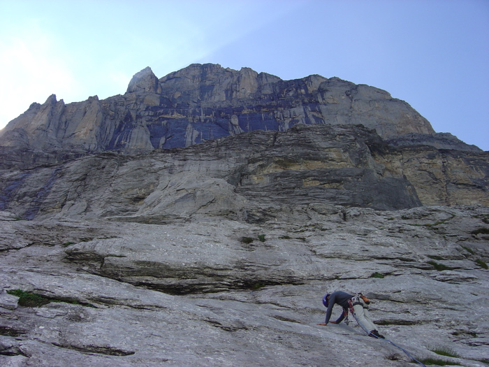 Par définition, l’être humain demeure un éternel insatisfait. Même si Il peut planer au-dessus des nuages durant les quelques temps qui suivent une belle réussite. Même si son paysage intérieur est complètement occupé par cette dernière. L’exaltation s’estompe fort rapidement. Ainsi réapparaissent des souvenirs plus anciens. C’est à ce stade-là que de nouveaux projets se dessinent. Et le rêve devenu réalité prend place dans le grand tiroir des expériences qui permettent d’aller toujours plus loin. Ce point de vue trouve une merveilleuse application lors de l’ascension de grandes voies. Une activité qui « prend la tête » au fil des étés plus ou moins humides. Après en avoir gravi un certain nombre, il est normal de vouloir tracer la sienne, mais où ? ? Il reste peu d’espaces vierges dans les Alpes. Un oeil de lynx est vital pour déceler de belles lignes potentielles, dans un bon rocher avec un rapport « marche d’approche / qualité et longueur » qui soit équitable. Les grands ouvreurs des deux dernières décennies en ont passablement explorées. Il serait peu gratifiant d’ouvrir une « bouse » à proximité des joyaux signés « Rémy », « Piola » ou encore « Ochsner » pour ne citer qu’eux. Pour faire ses armes, mieux vaut une paroi éloignée des regards. Ceci afin de ne pas risquer de se faire coiffer au poteau par une cordée plus aguerrie et aussi par franche antipathie pour la compétition. Cette histoire a commencé, sans le savoir, le soir du 17 juillet 1991. Je bivouaquais avec deux potes, sous l’orage, dans les pâturages de la Grande Scheidegg. Nous regardions les séracs s’écraser sur l’attaque de la voie du lendemain : le pilier ouest direct du Scheideggwetterhorn. Ce monstre peu connu avait créé chez moi une sorte d’illumination, un grand but dans ma brève carrière de montagnard. Mais je n’avais là que 17 ans et, malgré une impatience difficile à gérer, je sentais bien que l’heure n’était pas arrivé. C’est, par la suite, grâce à une boulimie pour les « trucs » engagés, que j’ai rapidement acquis de l’expérience, remplis mes bagages en quelque sorte. Un peu plus tard, en 1993, au lendemain de la première répétition du « Chant du cygne » à l’Eiger avec Julo mon frangin, la vision du Scheideggwetterhorn nous met tous les deux en transe. Un jour… Un jour ou l’autre, nous savons que nous tracerons une voie semblable dans cette face qui est tout sauf le parent pauvre de l’Ogre. Ce sera « notre » paroi, si l’on peut dire, et nous y vivrons plein d’aventures inoubliables avec nos amis. Une fois équipée, nous la gravirons en libre, toujours en se marrant, même jaune parfois. Avant de la livrer en pâture aux futurs répétiteurs. Une part de nos âmes, de nos personnalités, restera là-haut, pour toujours. Ainsi, le « Wett ‘ » sera ressorti de son ombre, il va demeurer pendant longtemps une balise essentielle de notre paysage. Et quand les autres balises, plus célèbres, seront à nouveau visibles, il n’aura absolument plus rien à leur envier ! L’esquisseJuillet 1996, Julo et moi, lourdement chargés plantons la tente non loin de la face. Nous grimpons aisément les 4 premières longueurs de notre future voie. Cette jolie entrée en matière ne nous fait pas encore prendre conscience de la grandeur du projet. Nous sommes à une demi-heure de marche du bistro et nous grimpons, un point c’est tout. Les grandes questions ne sont pas à l’ordre du jour. La ligne souhaitée n’est pas encore très précise, car ce n’est pas la place qui manque. Nous resterons entre les deux voies existantes, la « Niedermann » 1954 et « Trikolore » des frères Coubal (1989). Deux choses à noter : nous serons, par la suite, obligés de croiser cette dernière pour rejoindre l’ultime élancement, et nous découvrirons que la variante de sortie « japonaise » démarre depuis beaucoup plus bas que ce qui est décrit dans le topo du CAS. Le fil conducteur sera une très esthétique fissure. Une sorte de colonne vertébrale que nous baptiserons « Baston » en temps voulu. Hélas, une petite imperfection va déjà s’imposer pour la cinquième longueur, il faut, pour l’atteindre, traverser 100 mètres à droite. Il s’agit en fait de suivre le sentier d’accès au pilier ouest. De cette manière, même si notre « directe » en prends un coup, ce n’est pas dérangeant. Notre but tourne plus autour de la beauté et de la logique de l’escalade que de la rectitude. Ce premier ressaut raide constitue une excellente entrée en matière. Pour la petite histoire, même si des sections semblent encore expos, il faut savoir que certains spits ont été rajoutés ultérieurement… N’allez surtout pas croire que ce fut tout rose. Il y a eu des orages monstrueux, de la bise glaciale, des portages harassants ou encore des attentes aux relais interminables. La motivation en prenait parfois plein les dents et l’envie de tout abandonner nous a de temps en temps effleurés. Surtout en voyant que, de la 8e longueur, la perspective sur le pilier final n’avait pas varié d’un poil. Heureusement que la théorie des différentes balises dans le paysage des souvenirs attisait en nous une petite flamme intérieure. Une fois les plaies pansées, nous débarquions de nouveaux avec un cœur plus gros que nos sacs à dos. Pour varier un peu, et pour nous faire la « bouteille » comme on dit chez nous, nous sommes aussi allés en pèlerinage dans les terrains voisins. L’escalade de voies comme « Jednicka », « Batman »ou encore « Dingo » n’ont fait que gonfler notre désir de réaliser un chef d’œuvre semblable dans le « Wett’ ». Eté 1997, par un temps radieux, nous sortons du premier ressaut et, par des escaliers irréguliers, cavalons jusqu’à la nuit au milieu de la face. Le mur qui nous domine me laisse pantois… Celui qui deviendra « Céüse » va me hanter 