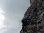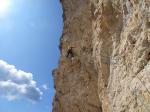 31.07-01.08.2018: Sass Maor, face sud-est, tentative à la Supermattita. Sur cette espèce de grande fusée calcaire traînait un vieux rêve commun, la Supermatitta ouverte par Manolo en 1980 avec seulement 7 pitons. Nous nous sommes levés à 3 heures du mat’ et avons deviné au clair de lune l’ombre de cet El Cap dolomitique tombant sur nous. Nous avons attaqué aux toutes premières lueurs du jour et surtout bien repéré la vire de la voie Solleder, 600m plus haut qui constitue la seule échappatoire, au cas où. Argument qui a fait son poids dans le choix de nos projets. Pour le reste, le V du topo ressemblait à du 6b, le VI à je ne sais pas quoi. Nous n’avons même pas osé imaginer le VII annoncé dans les longueurs du haut, péteuses en plus. 2-3 rares clous et lunules nous indiquaient que nous ne nous étions pas encore tout à fait perdus. C’est plus simple d’ouvrir une nouvelle voie que de vouloir répéter celle là. La joie de grimper dans cet énorme et impressionnant bouclier était pourtant bien présente. Puis, le ciel s'est chargé doucement, nous avons réussi à repérer un SPIT d’une voie plus récente qu’il est possible de rejoindre sans être trop au taquet dans une traversée de la mort avec nos cerveaux fatigués. Par 3 longueurs de cette voie nommée « Onyx », où le V était bien du 5 et le 6b du 6b, nous avons rejoint la vire Solleder avec les premières gouttes. Là, nous avons choisi de descendre cette vire, aller manger et dormir au rifugio Velo della Madonna, plus éloigné que ce que nous pensions et revenir terminer « Onyx » le lendemain. Nous n’avions rien pour bivouaquer donc cette solution nous allait tout à fait. Après s’être ravitaillés en bonne et due forme, pendant un nouvel orage, et reposé un peu, le réveil à sonné à nouveau alors qu’il faisait encore nuit. Puis nous sommes revenus au point atteint la veille pour sortir ce Sass Maor. Mais voilà, après un beau mur en vrai 5+ et une cheminée glauque en vrai 6, nous n’avons plus trouvé d’intérêt autre que la gaz fabuleux qui se déroulait sous nos pieds, avec du A0 dans toutes les longueurs et du rocher très péteux pour les passages de libre. Sans parler de la fatigue et du nuage noir qui commençait déjà à se former. Entre cette voie et celle de la veille, d’une extrême à l’autre au niveau de l'équipement, il existe le style de grimpe que nous aimons. Assez ! Retour ! Mauvais choix quant à la ligne choisie pour sortir. Pas grave, les montagnes ne partent pas et nous savons qu’il existe une autre voie, très belle semble t’il, pour sortir la paroi. Nous reviendrons, peut-être en automne, car il semblerait que le temps soit encore, ici, plus instable qu’ailleurs, les embruns marins ne sont plus si loin. Nous avons vécus là-haut une expérience fabuleuse, mais il faut une bonne journée de récup ‘ après cela. Quant à la Supermattita, nous pouvons juste dire « bravo » à ceux qui l’ont répété complétement, ils ne doivent pas être nombreux. Pour nous, ça sent déjà bientôt la fin, nous remontons plus près de la maison, au nord des Dolomites, au Passo di Sella.