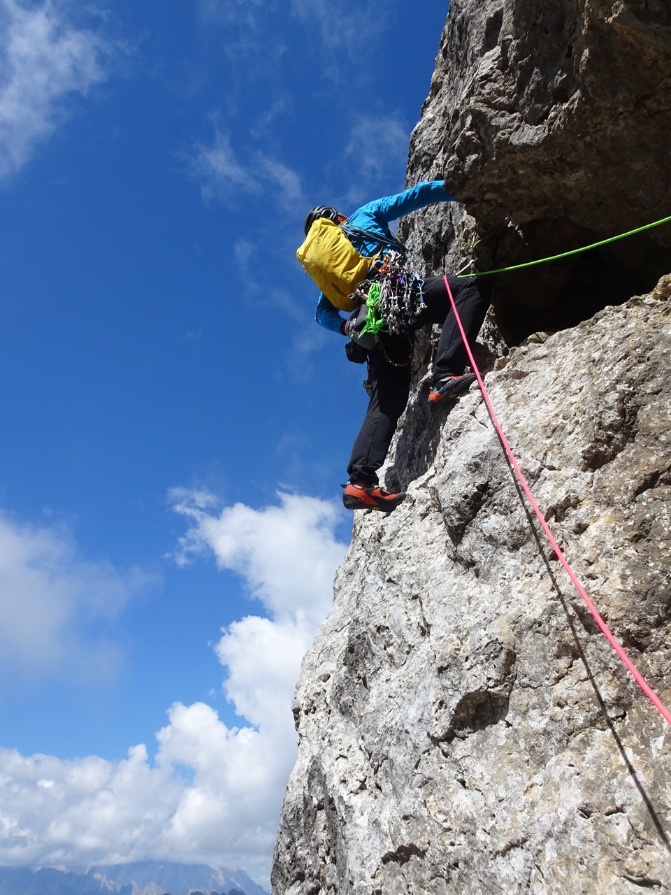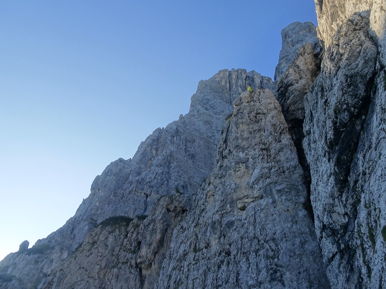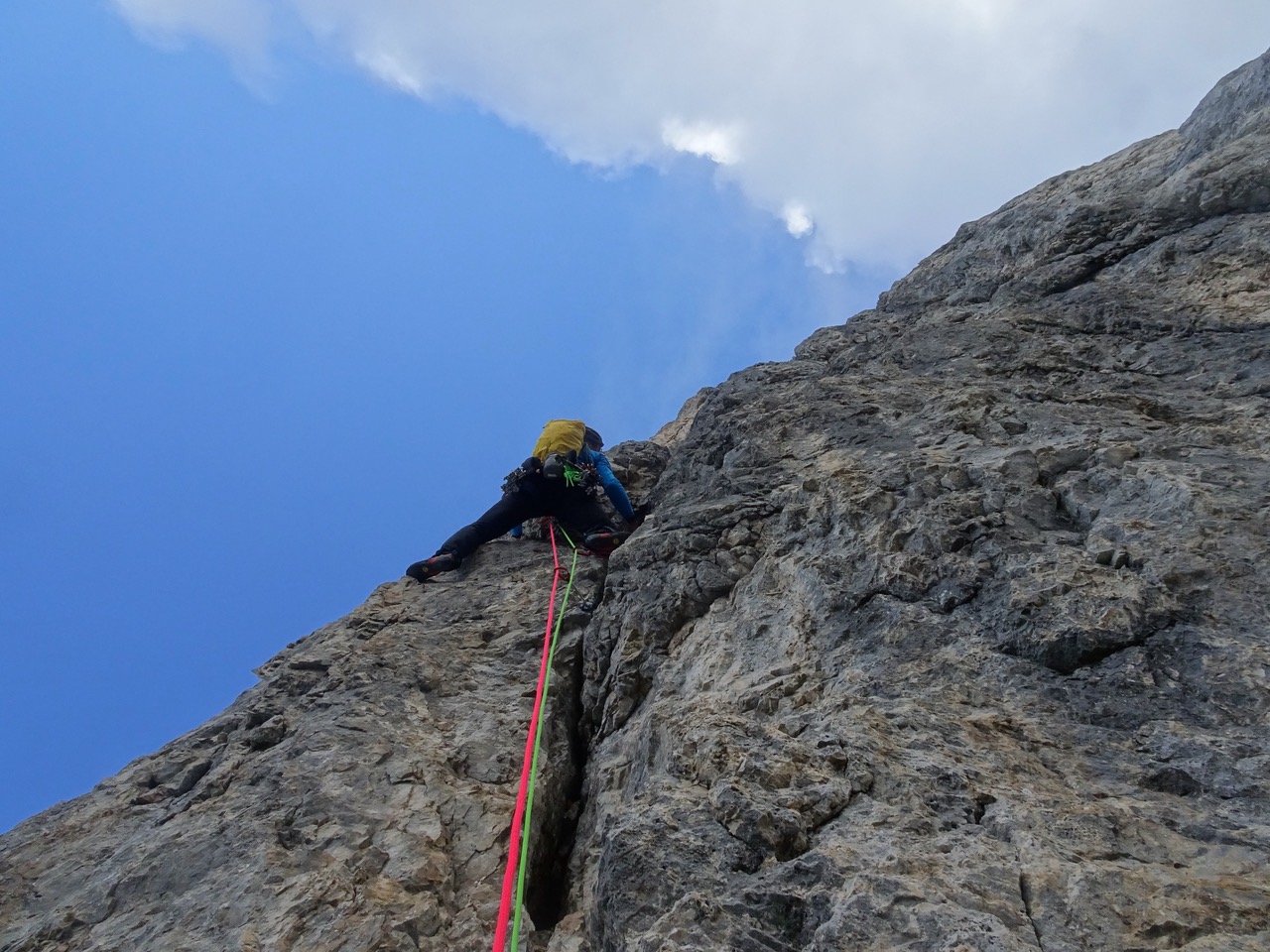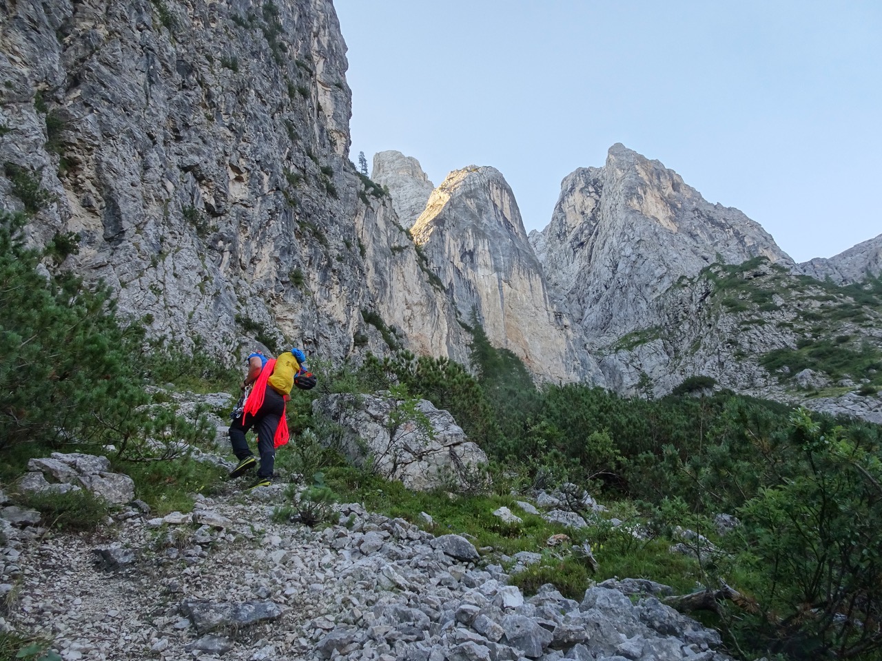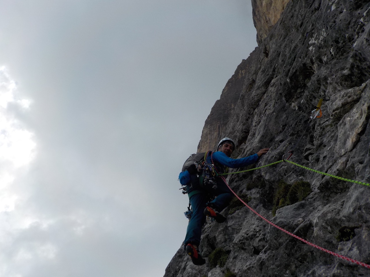 5.08.2019, après une bonne nuit dans le bien joliment gardé refuge…, cap sur une tranche d’histoire avec la mythique voie Buhl (1950) de la Cima Canali, qu’une vieille connaissance nous avait vivement conseillé. Ce fut pour nous un excellent jogging. Respect tout de même au grand Hermann, sa ligne de fissures est vraiment majeure. Après avoir passé par le sommet et sa chaotique descente, heureusement marquée de points rouges, nous nous sommes attablés au refuge à midi précise pour un repas bien mérité. C’était notre troisième jour, il ne nous en fallait pas plus. Il est temps de descendre, trouver un camping et une douche dans une autre vallée et attendre qu’une grosse vague d’orages passe. Nous sommes confiants pour de nouvelles aventures, nous nous y sommes bien préparés.