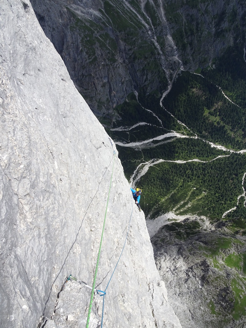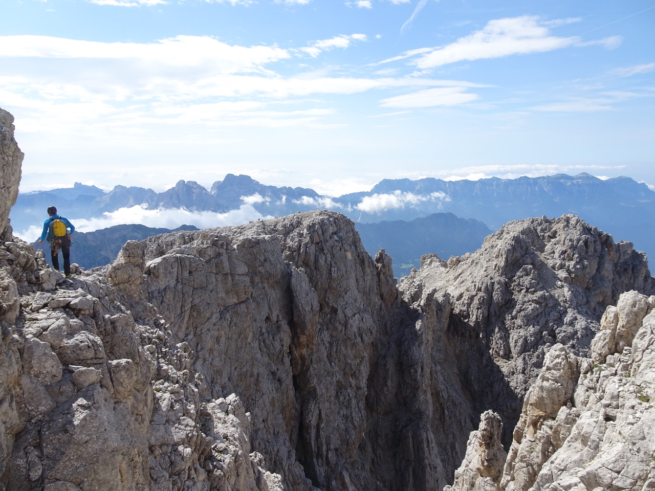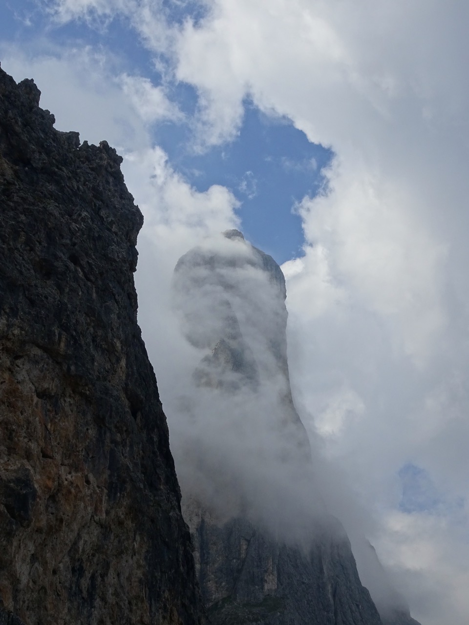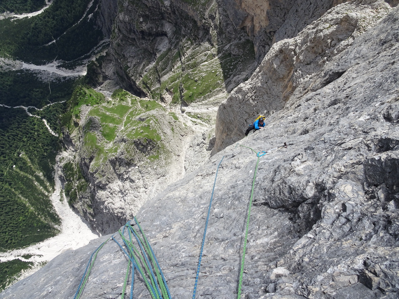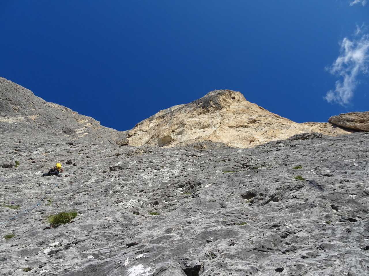5.08.2019, après une bonne nuit dans le bien joliment gardé refuge…, cap sur une tranche d’histoire avec la mythique voie Buhl (1950) de la Cima Canali, qu’une vieille connaissance nous avait vivement conseillé. Ce fut pour nous un excellent jogging. Respect tout de même au grand Hermann, sa ligne de fissures est vraiment majeure. Après avoir passé par le sommet et sa chaotique descente, heureusement marquée de points rouges, nous nous sommes attablés au refuge à midi précise pour un repas bien mérité. C’était notre troisième jour, il ne nous en fallait pas plus. Il est temps de descendre, trouver un camping et une douche dans une autre vallée et attendre qu’une grosse vague d’orages passe. Nous sommes confiants pour de nouvelles aventures, nous nous y sommes bien préparés.