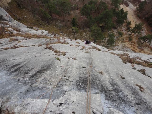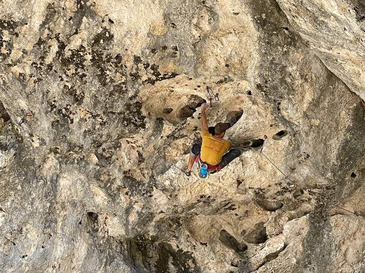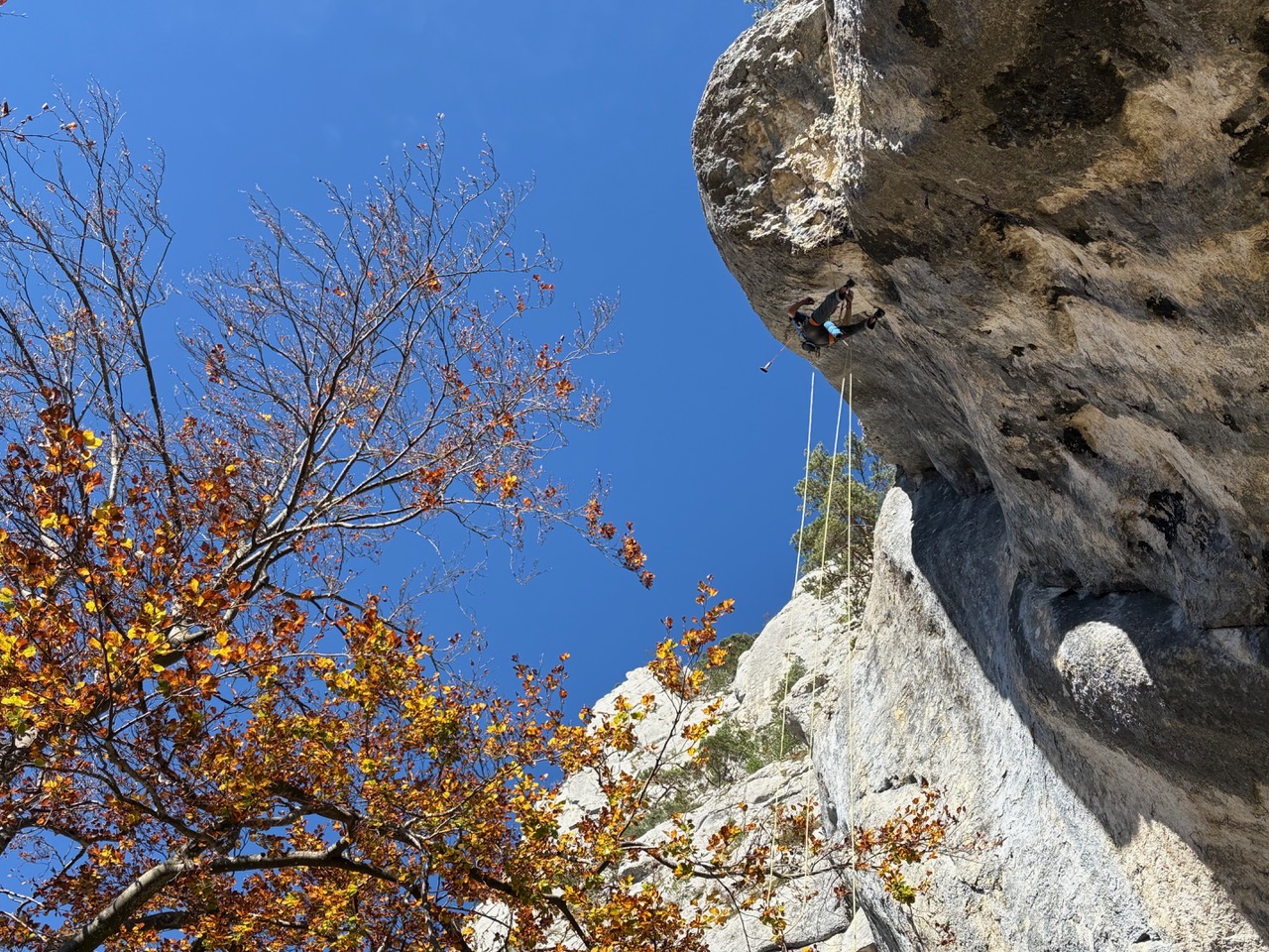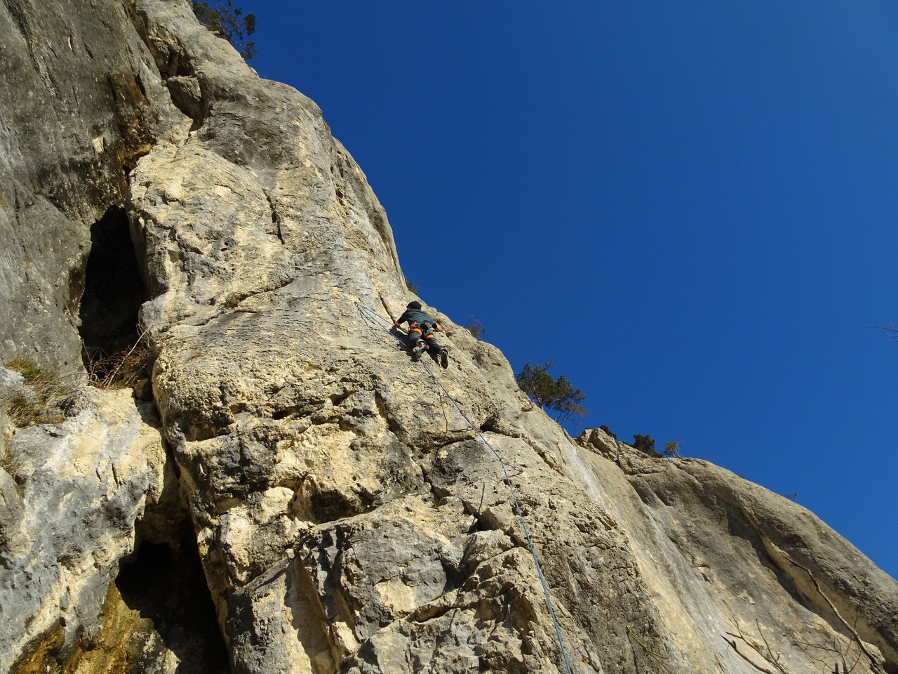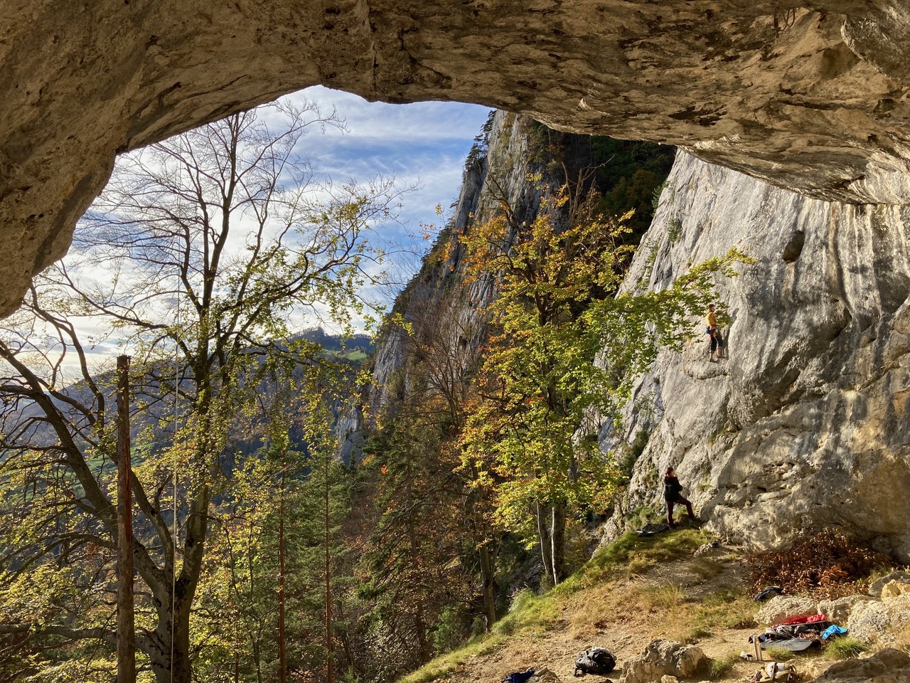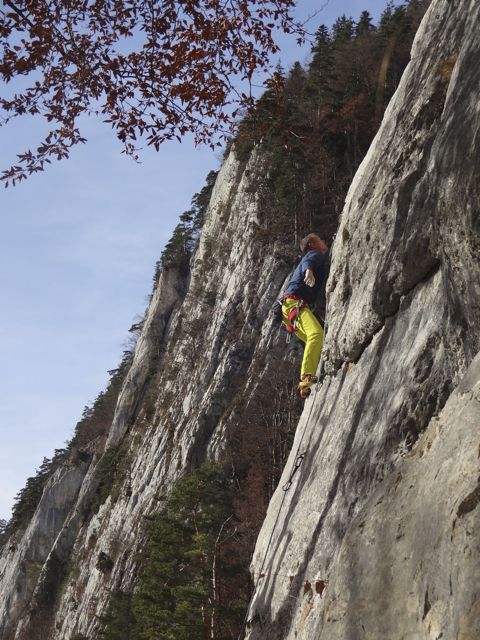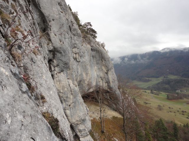 La grotte de Welschenrohr, 2025Toujours de l’activité en automne dans ce lieu paradisiaque. Topo CAS de 2012 ou l'on trouve aussi les grandes voies, ou Extrem Jura de 2017 où il y a les voies plus récentes. 2024: 2 spits rajoutés au départ de Mix-Max, rien de plus, pour ce beau 6a technique qui est sympa comme voie de chauffe. Changement de départ à Lobotomie sporting club, voir ci-dessous. Et un petit tour dans la 2e partie de Crépuscule / transfert, voir ci-après. *** 11.03.2025, cette dernière voie de 35 mètres est enchaînée en libre par Dimitri Vogt, verdict: 8b+, les spits ont été mis il y a 30 ans, en 1995, et je pense que j'ai eu bien raison d'aller les mettre *** « Refresh », définitif (voir photo n°6) de la première longueur de « Crépuscule Transfert » un splendide 8a en conti raide équipé par mes soins en 1995, enchaînée pour la première fois par D. Burdet en septembre 1999 ; il y a eu pas mal de répétitions, de différentes manières depuis que j'ai changé l'emplacement de certains spits en 2015 ou certains allaient se reposer dans le trou ou se trouve le relais "d'exil", j'en parle un peu plus loin. Désormais, il faut faire le crux original, tout droit. Le début de la seconde longueur a été quelque peu modifiée en 2024, il faut dire que je n'ai peut-être pas vu certaines prises en 1995, et de toute façon, c'était déjà un sacré job d'ouvrir ce truc du bas avec mes crochets et mes étriers. Toujours-est il que je pense que ça passe et qu'il faudrait s'y atteler sérieusement. A noter qu'il est possible d'atteindre le relais central de la voie, au haut du 8a, en démarrant par" Via dei Venti" suivi de la sortie de "Je t'en remets au vent", ça fait 25 mètres de 6b engagé pour aller travailler un truc dur, c'est intéressant. Refresh aussi pour sa voisine de droite, « Je t’en remet au vent » qui sort de la grotte à droite, entre la 4e et la 5e boucle de « Crépuscule transfert ». Il s’agit d’un très beau 7c de conti avec un engagement certain sur la fin, relais identique à la précédente. Enchaînée pour la première fois par N.Zambetti en octobre 2006. Enfin, une option sympa est de grimper " exil sur planète fantôme", 6c » puis de forcer le toit du dessus depuis la petite grotte du relais, 1 spit avec une dégaine en place permet de rejoindre « Crépuscule… » à la 6e boucle. Estimée à 7c+, forcément moins dure que la ligne principale, je n’ai pas eu vent d’un enchaînement à ce jour. Elle se nomme "le fantôme du crépuscule". Ca travail dure dans « Lobotomie sporting club », cette voie qui ressemble un peu à "l'os" de Buoux, probablement deux longueurs en gros 7, probablement possible en une, à voir. Info importante de 2024, pour essayer cette dernière, il faut aller au pied de "Vue des Alpes", un départ en 4+ depuis une petite grotte donne accès à la voie. Il n'y a plus de corde fixe comme décrit précédemment. Ca bosse aussi dans le plafond de " Mathématiques souterraines " , est-ce qu’il passerait en libre ?? Je suis en attente d’infos. Quelle ligne en tous les cas !! Enfin, il reste « Animal en quarantaine » où il semblerait qu’il manque une prise. Ce serait mieux de faire appel à des grimpeurs de top niveau, plutôt qu’a des tailleurs (de taupe niveau…) . Pfeiler, Via dei Venti et la première longeur de Mix-max ont été rééquipées par mes soins. en ce qui concerne la seconde longueur de cette dernière, je me suis décidé à la parcourir en 2022. C'est plutôt sale, et l'escalade est bizzare dans un dièdre rond, j'ai utilisé un petit alien et les cam violet et vert. J'ai aussi changé la cordelette du relais et mis un maillon, rappel de 35 ou 40m. "Hydra" et "Vue des Alpes", les deux superbes grandes voies qui démarrent à gauche de la grotte ont rééquipées par Martin Brunner & cie en été 2018. Elles sont très conseillées. Il faut un bon paquet de dégaines ainsi que de quoi redescendre en rappel. Plus haut, vers l'écusson, dans la "Glatti Flue" Il y a "Messias", 5 longueurs rééquipées. Puis à gauche de celle-ci "Abyss", 4 longueurs (prises taillées), et à droite "Black rain" 4 longueurs également (prises taillées aussi). Le pilier de Rosière est une aventure sympa ou il faut quelques friends et coinceurs, et celles qui restent, en artif, je ne les connais pas. N'oubliez pas que l'escalade est un sport aventureux qui se pratique sous la propre responsabilité du grimpeur qui s'y rend. Que ce soit au niveau de l'équipement en place et de son utilisation, du choix de l'itinéraire ou encore des dangers objectifs tels que chutes de pierres ou autres. Je décline toute forme de responsabilité ou toute mise en cause au cas ou un accident surviendrait dans l'une des nombreuses voies décrites dans ce site internet. Pour plus d'informations...