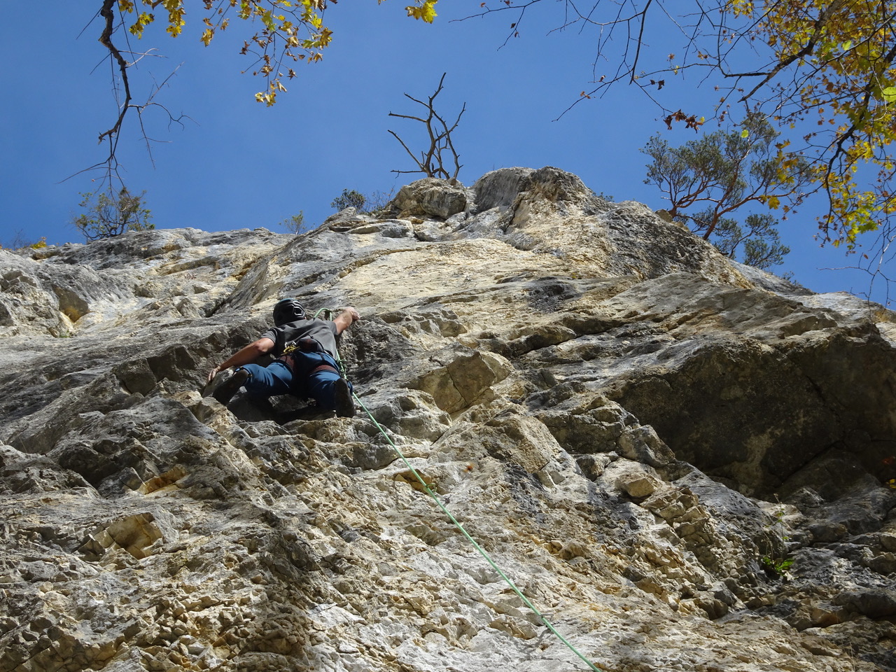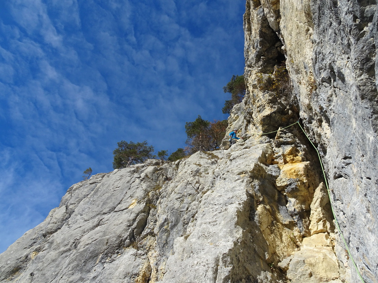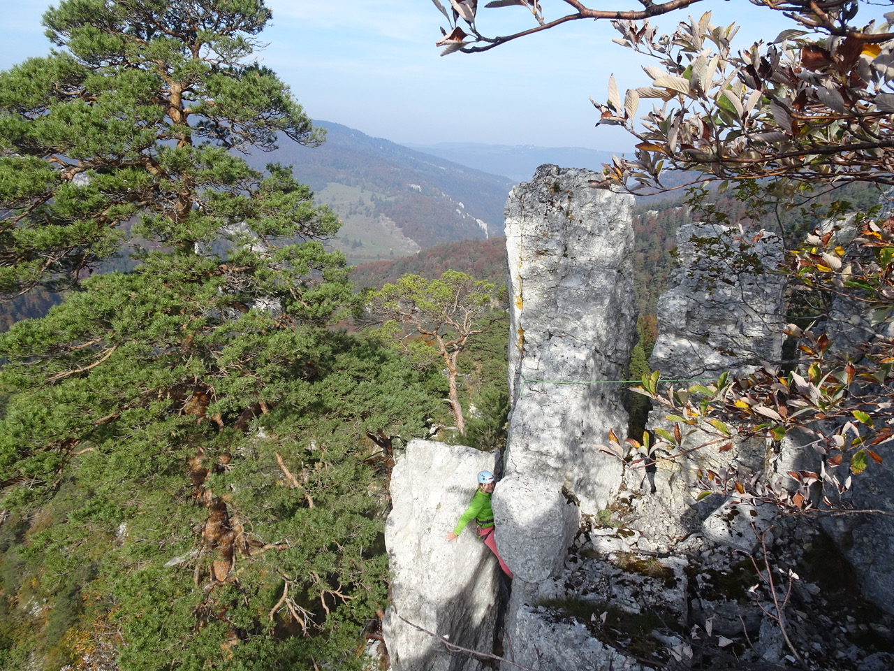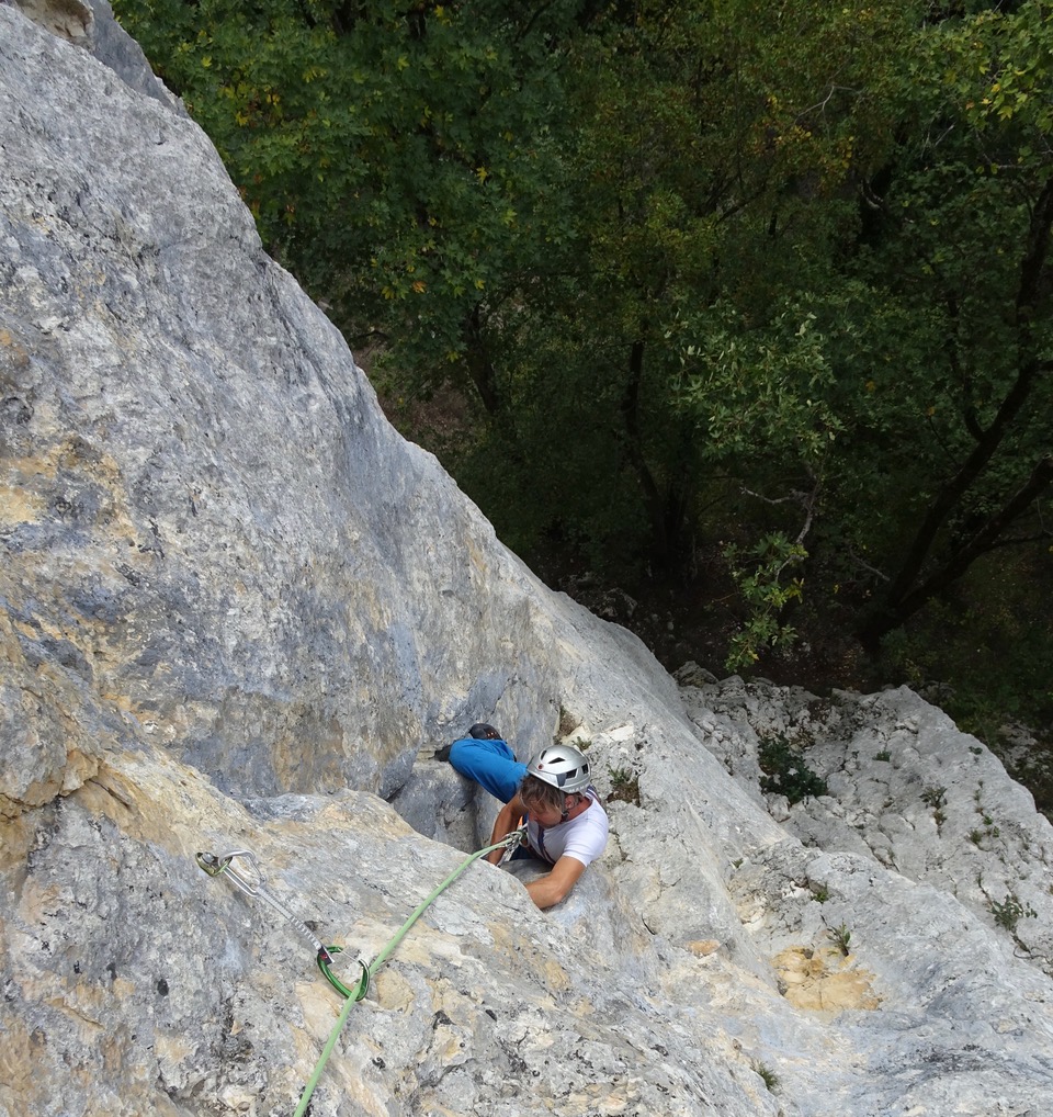 Les deux dernières créations, en automne 2018 pour meubler un peu. Liberté : il n'y a pas de mauvais rocher, il n'y a que des mauvais grimpeurs (Georges Livanos) 2lg, 5b / 6a, rocks, camalot 0,3 à 3. L1 (5b) comme Epicure, puis, au lieu de partir dans le mur raide, continuer le dièdre jusqu’au relais, L2 (6a), 3 spits puis traverser la cheminé à gauche (1 spit), piton et tirer à droite, au plus facile, pour rejoindre le relais de A&C. Rocks, camalot 0,3 à 3. Une ligne évidente, engagée et alpine ! Démocratie bananière : 2lg, 5b / 6c Près du relais de Liberté, un petit bout de corde file à gauche, puis deux spits mènent au relais (5b). L2, tout droit dans le pilier central (6c), passer près d’un arbre avec cordelette, puis un spit, et traverser à droite, sortir par un petit dièdre, relais autour d’un gros arbre.