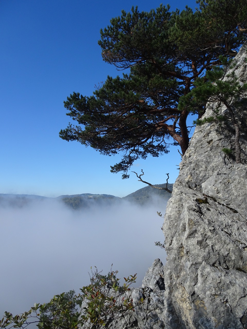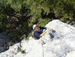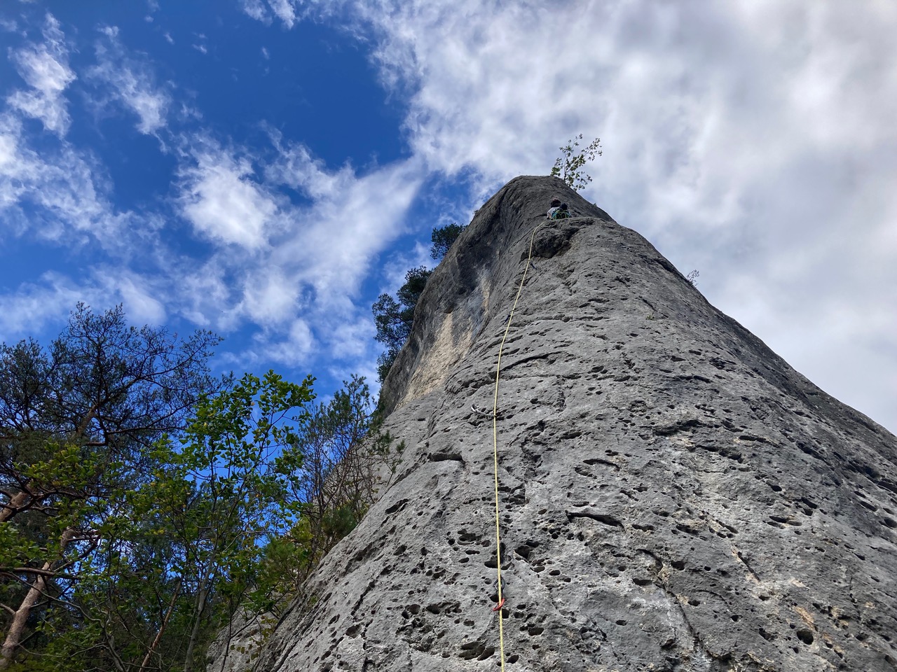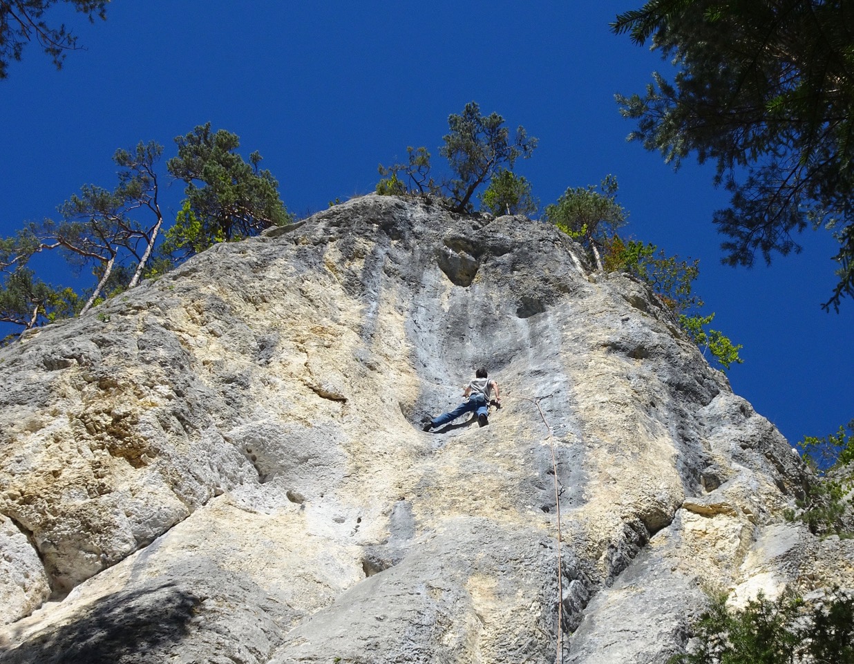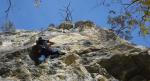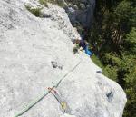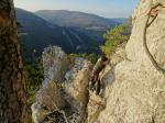 Les deux dernières créations, en automne 2018 pour meubler un peu. Liberté : il n'y a pas de mauvais rocher, il n'y a que des mauvais grimpeurs (Georges Livanos) 2lg, 5b / 6a, rocks, camalot 0,3 à 3. L1 (5b) comme Epicure, puis, au lieu de partir dans le mur raide, continuer le dièdre jusqu’au relais, L2 (6a), 3 spits puis traverser la cheminé à gauche (1 spit), piton et tirer à droite, au plus facile, pour rejoindre le relais de A&C. Rocks, camalot 0,3 à 3. Une ligne évidente, engagée et alpine ! Démocratie bananière : 2lg, 5b / 6c Près du relais de Liberté, un petit bout de corde file à gauche, puis deux spits mènent au relais (5b). L2, tout droit dans le pilier central (6c), passer près d’un arbre avec cordelette, puis un spit, et traverser à droite, sortir par un petit dièdre, relais autour d’un gros arbre.