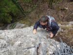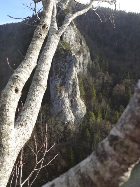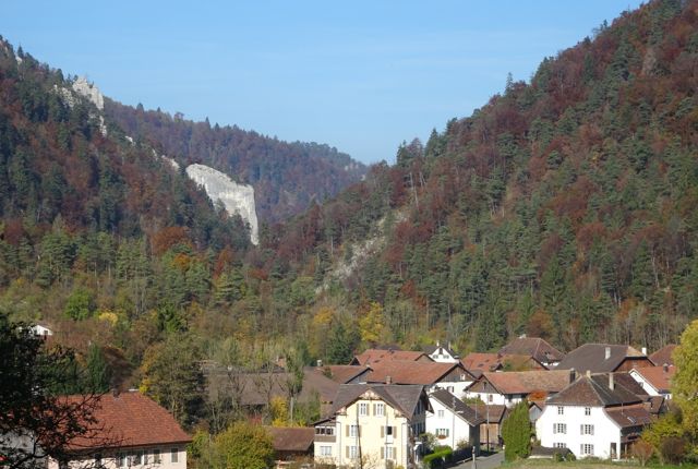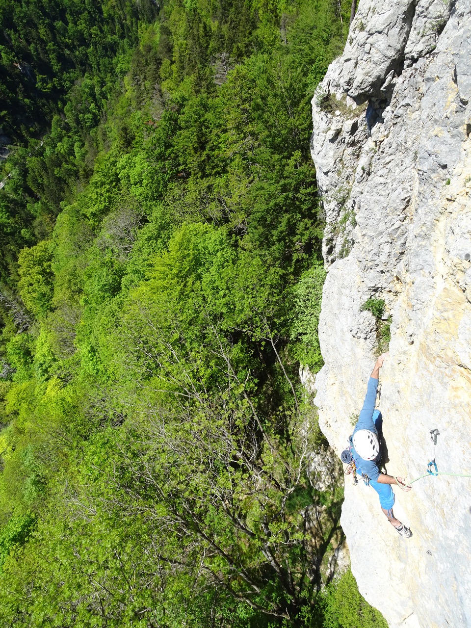 Cluse des Forges: 2015: Voici une nouvelle voie dans les Gorges du Pichoux, dans la cluse des Forges en aval d'Undervelier. Sur le Pilier du Rouge Pertuis, "Chez la Rachel" est dédié à la tenancière du bistro du proche village où nous aimons bien, Steph et moi, aller nous désaltérer après une bonne session "grimpe". La voie a été ouverte du bas, en automne 2015, puis nettoyée du mieux que nous pouvions. Il y a peut-être encore un petit coup à donner, peut-être que les ascensions, que nous souhaitons nombreuses, aideront. Elle est plutôt bien équipée dans le but qu'elle se répète. A noter que certains spits ont été rajoutés après coup, c'est bien connu, quand on ouvre du bas, on se lâche toujours un peu. Pour ce qui est de la difficulté et des infos, tout est sur les photos ci-bas, 12 dégaines et une corde de 60m, en ce qui concerne le matos à prendre. Les cotations, on en sait rien, la troisième semble être un peu plus dure, et plus jolie aussi, à vous de voir. C'est sympa de respecter les consignes figurant sur le panneau situé au pied des voies, une fois le barrage traversé. Si il est rouge, il y a assez d'autres endroits où aller grimper. Le rapport entre la marche d'approche, une minute au moins, et la longueur de l'escalade est assez exceptionnel, surtout si on enchaine avec le pilier du Forgeron situé juste en face. Ce dernier a été gravi par Germain Paratte et Maurice Brandt en 1967, en partie en artificiel (tout comme le Pilier du Rouge Pertuis par les mêmes en 1972, plus d'infos suivront sur cette voie). Puis, la génération suivante, menée par Philippe Steulet, le parcourt en libre, en retirant les pitons inutiles, ce qui ne manque pas de faire grincer des dents bon nombre d'anciens qui ne peuvent simplement plus monter, "prends le marteau, ça passe sans le clou...". Quelques spits sont placés au tamponoire autant dire qu'il y en a peu. Mais les 4 voies du dernier élancement "Soleil", "Ganja" (l'originale de 1967), Docteur Jekyll et Mister Hide sont devenues des incontournables. Beaucoup plus tard, c'est mon frère Julo qui équipe le flanc sud du pilier. Des voies toujours aussi superbes voient le jour. Après une première partie de difficultés "humaines", les sorties en dévers sont souvent constituées de pas de blocs, à ma connaissance, elles n'ont pas toutes encore été réalisées en libre. Il existe aussi la Ruelle des Morts, une voie de mon cru, qui reprend en libre la voie de 1967 jusqu'à la terrasse et qui sort en "Trad" dans la grande fissure qui sépare "Soleil des voie de Julo. Pour cette dernière voire la rubrique trad dans le Jura. Bref, cette région assez perdue est riche en cailloux dans un périmètre restreint, la falaise du Bobo au Tchaïbez tout proche vous reposera les nerfs. A ne pas manquer, la « dure » du coin, « la violence », une couenne « top » dans des trous, dignes du sud. Puis le Roc du Pichoux, Pink Floyd et Grand écran à Soulce, la Jacoterie, la grotte de Sainte colombe, les Côtes de Chermattes et d'autres falaises confidentielles, sans oublier l'hiver. Il y a assez de topos entre Filidor et ceux du Club Alpin.