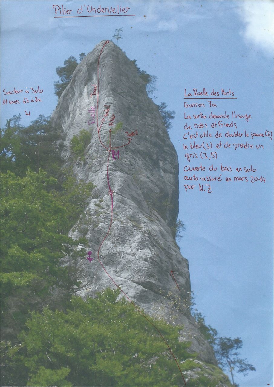 Mur de gauche, orienté sud Voir photo en début de rubrique Le Chant du Gros : 4lg, 6a, 7b, 7b+, 6b rocks, aliens et camalot 0,5 à 2, violet, vert, rouge, jaune L1, du haut de la corde fixe, tirer à gauche, ne pas rater le piton sur le pilier. L2 droit au dessus, 3 spits puis ça engage, fissure jaune à protéger et spit à nouveau. L3 dans le gros dévers, bien gazeux (premier enchaînement par Julo Zambetti le 2.11.2020) L4 sur le fil du pilier, 1 spit puis traverser à droite pour rejoindre le rappel. Voie de gauche : 3lg, 5b, 6c, 6b+, à Pincette et Gégé Rocks, Cam 0,3 à 3,5 L1, du haut de la corde fixe, remonter une écaille délitée. L2, la fissure athlétique, superbe longueur ! L3, 3 spits mènent aux deux sorties possibles en fissures « écarte les pieds, car à gauche et à droite, c’est aussi du rocher », à droite c’est plus « montagne » et un camalot 4 peut être utile, à gauche, c’est moins large, plus agréable. Ouverture, octobre 2016, N. Zambetti / S. Gasser. Belle voie exigeante ! J'veux du cuivre : 2lg, 7a, 7a+ Il fallait trouver une ligne plus « moderne » au milieu de ce mur, la voici ! En souvenir de la BFM cuivrée, à la pression, servie au Chant du Gros en écoutant, entre autres, Alain Souchon. Rocks, Cam 0,3 à 3 L1, départ près de la corde fixe, mur incliné avec 1 piton et deux spits, puis tourner le pilier, 1 piton au dessus du surplomb, et deux spits, superbe longueur ! Relais commun à la voie de gauche, c'est également à cet endroit que les deux voies se croisent. L2, 1 spit commun avec cette dernière puis traverser sur le pilier à gauche. Un pas obligatoire commun au CDG puis tirer à droite (1 spit) pour rejoindre le relais officiel. Voie de droite : 2lg, 6a, 6b, à Pincette et Gégé La fissure, majeure ! Rocks, Cam 0 à 3,5. L1, du haut de l’autre corde fixe, remonter toute la fissure /dièdre à protéger. L2, toujours la même fissure, encore plus belle, en tirant sur les friends, ou pas « hein gosse, t’as vu ? En jaune ! ». Sortir à gauche dans un mur où on trouve 2 spits. Ouverture, 12 Octobre 2016, N. Zambetti solo auto-assuré.