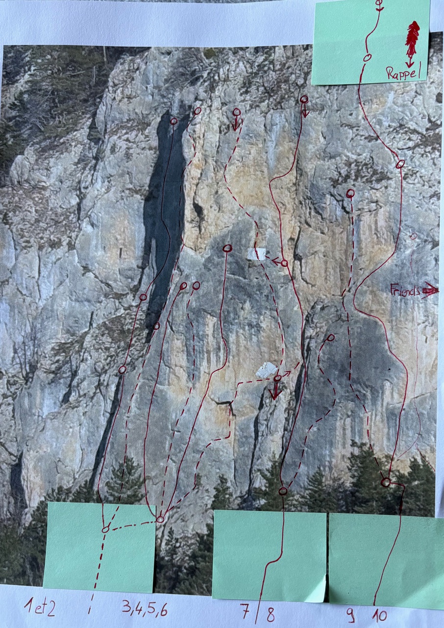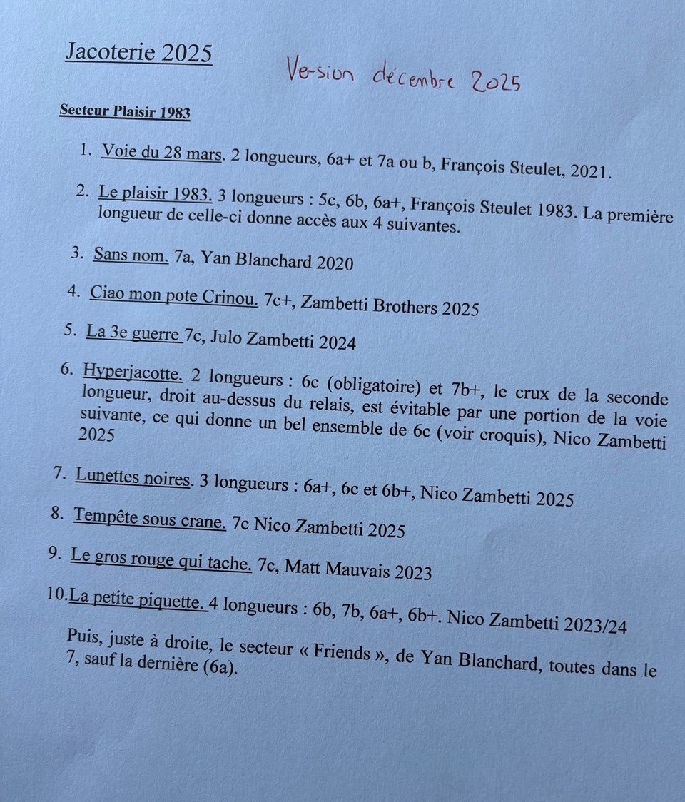 La Jacoterie 2025Passablement d’activité dans ce superbe site au somptueux rocher acéré. De plus, l’endroit est parfait pour l’hiver quand le brouillard ne déborde pas de la vallée de Delémont. Les ouvreurs principaux sont François et feu Philippe Steulet, sans oublier Fred Lapaire et Michel Bréchet. Yann Blanchard a passablement oeuvré dans le secteur, suivi de ses cousins: N+J Zambetti. Il y en a encore d'autres, pardon si je les oublie, et comme il y a beaucoup de secteurs, un bon topo ne serait pas de trop. Parfois j’entends des remarques qui me laissent songeur et qui reflète bien le monde aseptisé dans lequel on vit, surprotégé, sur-assuré, surfait. Je me permets ici d’y répondre. Chacun a le droit de faire comme il l’entend bien sûr, il n’y a pas (encore) de normes DIN ou VSM pour déterminer la distance « réglementaires » entre les points. Pourtant, moi je prétends que pour pouvoir revendiquer un niveau, il faut monter au-dessus du point, là où l’on est obligé de garder son sang-froid pour faire le pas suivant, sous peine de voltiger ; de l’escalade « libre », comme on dit. Mousquetonner un point tous les mètres équivaut, à mon sens, à grimper en second ou faire du True Blue ou encore de la via feratta. A chacun de choisir ce qu’il lui plaît ou pas, ce n'estvpas le choix qui manque. Pour ma part, quand j’ai appris à grimper, il n’y avait pas encore toutes ces moulinettes, et les voies étaient souvent dotées de zones où il ne fallait pas tomber. Parfois nous étions forcés de laisser un mousqueton de but et renoncer; puis s'entraîner afin de revenir plus fort pour réaliser le projet. J’ai développé une bonne notion de ce qu’est l’engagement, une bonne confiance en moi et des réflexes qui m’ont rendu beaucoup de services au cours de ma carrière. Je ne vais surtout pas dire que "c'était mieux avant", loin de là, mais un peu plus de réflexion et d'ouverture d'esprit ne ferait pas de mal, parfois. Non, l’escalade n’est pas un vulgaire sport normalisé ou seule la performance compte, c’est une activité libre et parfois aventureuse. Ne mélangeons pas tout et laissons les murs d’escalade, et surtout le monde qui va avec, aux villes. Qu’importe, qu’on mette beaucoup de spits ou peu, le travail et l’abnégation que demande l’ouverture de voies, et leur nettoyage, est souvent sous-estimé de certains répétiteurs qui se contentent juste de râler et de mettre des étoiles comme au Gault et Millau. Comme dans toute œuvre que l’on créé avec amour, on y met de sa personnalité. Merci à tous ceux qui, sans exceptions, nous permettent de nous éclater dans notre bô Jura, et qui partagent leurs créations. Pour en revenir aux nouveautés 2023 - 25, il faut monter à la 7e épingle à cheveu de la route qui mène à la ferme de la Jacoterie ; pour situer, la voie nommée « Bestialidé » se trouve à la 3e épingle. De la 7e, une minute de marche dans la forêt mène au départ des nouvelles créations (voir image n°1), avec tout à gauche, le départ du "Plaisir 1983"qui mène aux voies 1 à 6 de mon topo. Ensuite, au milieu, on trouve la voie 7 "Lunettes noires". Un peu plus loin la voie 9 "La petite piquette" et enfin les chaînes qui permettent de monter au secteur "Friends" Sauf erreur, toutes les voies ont été enchaînées, elles sont toutes superbes. Le n° 5 "La 3e guerre" 7c est en passe de devenir classique, elle s'est même gravie à vue en février 2025. "Hyperjacotte" est une voie très "montagne", de deux longueurs, avec un pas obligatoire dans la première, qui comme son nom l'indique, donne l'impression de grimper sur une râpe à fromage. Lunettes noires, celles que j'ai envie de porter quand je regarde le monde, pourrait devenir une classique pas trop dure, à l'image de "Plaisir 1983". A son premier relais, on peut tenter la "Tempête sous crâne", une magnifique longueurs aux limites de l'adhérence.